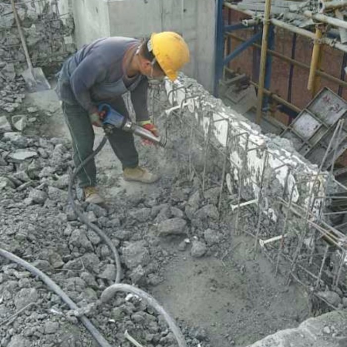 對于原鋼筋混凝土結(jié)構(gòu),用金剛石圓盤鋸片切割,將原混凝土全部去除,采用分段作業(yè)。切割時控制切割深度,不要切入原始結(jié)構(gòu)。針對原有復(fù)雜的混凝土結(jié)構(gòu),采用金剛石繩鋸切割和金剛石筒鋸,鉆床組合進(jìn)行鉆孔和切割。
