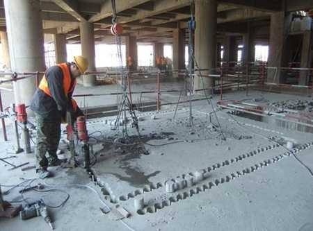 對(duì)于原鋼筋混凝土結(jié)構(gòu),用金剛石圓盤鋸片切割,將原混凝土全部去除,采用分段作業(yè)。切割時(shí)控制切割深度,不要切入原始結(jié)構(gòu)。針對(duì)原有復(fù)雜的混凝土結(jié)構(gòu),采用金剛石繩鋸切割和金剛石筒鋸,鉆床組合進(jìn)行鉆孔和切割。