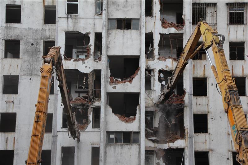 雖然用挖掘機(jī)拆除建筑物的速度較慢,但在樓層比較近的情況下還是比較安全的。