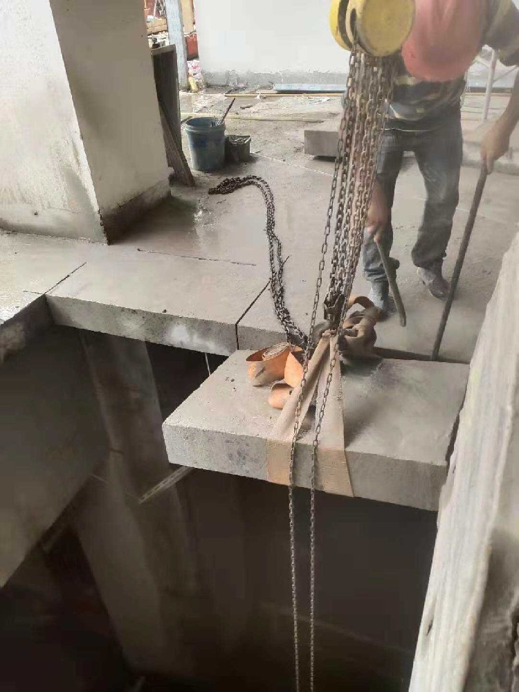 (4).主體結(jié)構(gòu)樓板切割前,先用型鋼做起吊龍門,吊架固定在橫梁上。用鉆孔機(jī)在要切割的樓板上均勻地鉆4個(gè)孔,將鋼絲繩穿過,然后掛在兩個(gè)手拉葫蘆的掛鉤上?;炷燎懈詈蟮钠鹬睾J放置在吊架上。