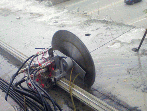 (3).地板外圍用平推式電動(dòng)切割機(jī)切割,中間部分用膨脹螺栓固定在待切割表面小切割機(jī)的軌道上,分塊切割。