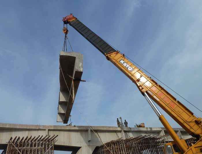 紅旗架橋機(jī)、遼原型架橋機(jī)屬于此類,起重量也為噸。動(dòng)臂由左右兩根箱形梁組成,兩根梁貫穿機(jī)身并前后延伸。兩端有折疊立柱,每個(gè)立柱由兩條腿桿組成。紅旗型的兩道光束中間距離為3、4米,遼原型車的距離為4、8米。兩臺(tái)箱梁上有兩臺(tái)小車,可沿吊桿縱向行駛。吊梁小車置于桁架上,可沿桁架橫向行駛。待架設(shè)的梁(或整梁)可由鐵路平板車直接送至架橋機(jī)后臂下方。由吊梁小車提升后,由桁架車前移,再由吊梁車橫向移動(dòng),然后落梁。少量。該型架橋機(jī)前后端可吊放梁;改變光束方向時(shí),無(wú)需轉(zhuǎn)身;為適應(yīng)曲梁,前后臂可在水平面內(nèi)擺動(dòng);立件時(shí)無(wú)需移動(dòng)橫梁或刻度盤。道、梁可就位; “送梁”不需要橋梁跨線或?qū)S眠\(yùn)梁車。