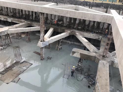 基坑深度深,需要鑿除五道內(nèi)的支撐。在基坑支撐拆除過(guò)程中,整個(gè)基坑的應(yīng)力平衡通過(guò)三種支撐結(jié)構(gòu)支撐到地塊結(jié)構(gòu)上。拆除支撐順序選擇、渣土運(yùn)輸及成品保護(hù)。施工過(guò)程安全管理。