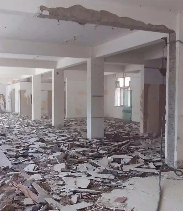 拆除其余樓板:用液壓鉗將剩余需拆除的樓板破碎,將要拆除的樓板清理干凈;檢查所拆除的砼塊是否給其他結(jié)構(gòu)或人體造成危害;當(dāng)距框架柱200mm處不能用液壓鉗,剩下部分用人工剔鑿,切割拆除的混凝土塊,運(yùn)至甲方的外運(yùn)場地。